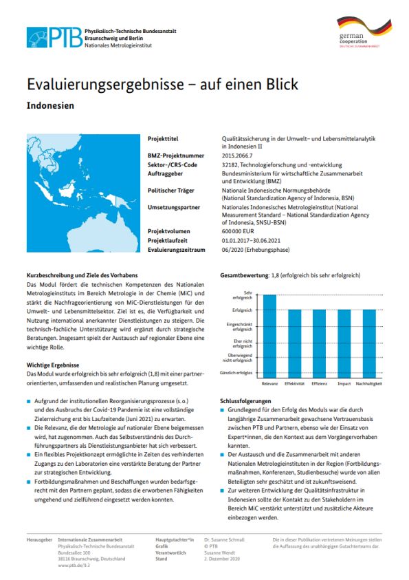 The goal of the project is to increase the accessibility and use of internationally recognized metrological services in the areas of the environment and food in Indonesia. The project strengthens the technical competencies of the Metrology in Chemistry (MiC) group of the Indonesian National Metrology Institute and promotes demand-orientation of MiC-related services.