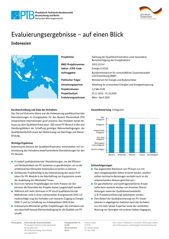 The goal of the project is to improve the quality and reliability of photovoltaic installations in Indonesia and to expand the capacities of quality infrastructure institutions.