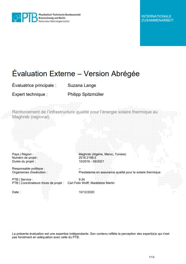 The goal of the project is to establish the quality infrastructure (QI) in the field of solar thermal energy and to assure the availability of the respective specialists. To this end, four activities are being implemented: 1. guiding solar thermal testing laboratories toward accreditation, development and marketing of their services, 2. supporting calibration laboratories to help them achieve international recognition, 3. integrating QI into relevant university courses and 4. supporting the selection of a certification system for solar thermal systems.