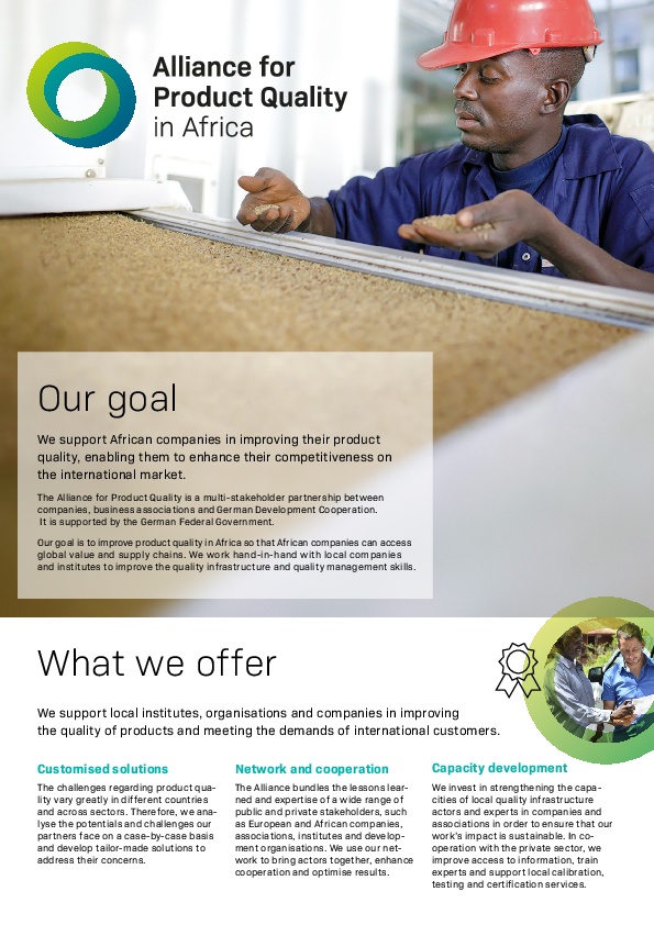 The brochure highlights the project "Alliance for Product Quality in Africa" by stating its main intention, and how it will help prosper the African partner countries. Via a multi-stakeholder partnership between companies, business associations, and German Development Cooperation, the project aims to improve their the product quality of African companies, enabling them to enhance their competitiveness in the international market. Moreover, the publication describes how both parties (African and European companies) benefit from the Alliance.