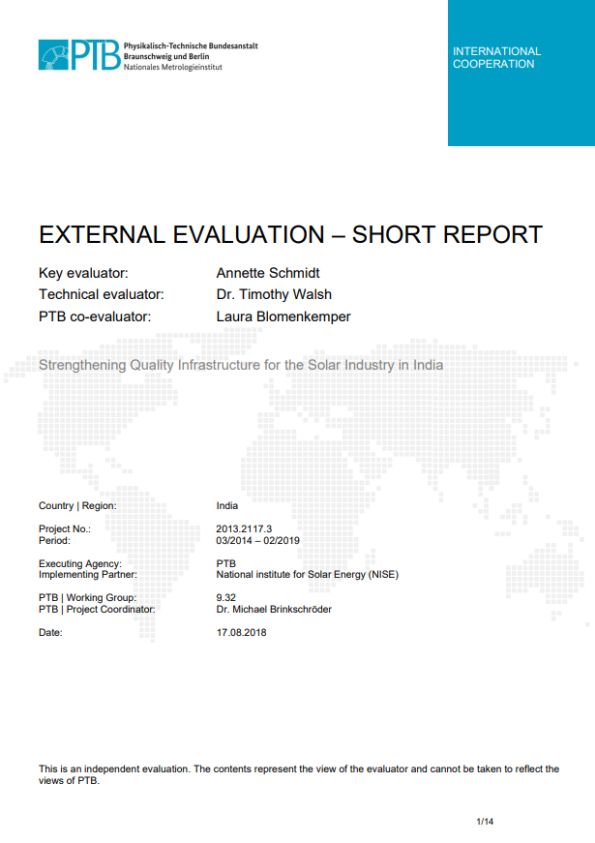 The goal of the project is to improve the quality assurance and reliability of solar energy systems in India. To this end, four outputs shall be achieved: 1. strengthened capacity in the Indian metrology system, 2. conformity assessment bodies use assurance procedures, 3. standardization and regulatory institutions are informed about international requirements and good practices and 4. awareness raising in the private and state owned solar sector.