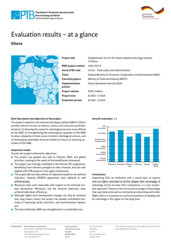 The project aimed to enhance Ghana’s National Metrology Institute (NMI) by identifying service needs, strengthening metrological capacities, and ensuring financial sustainability. This supports industry, science, and consumer protection while securing long-term operational stability.