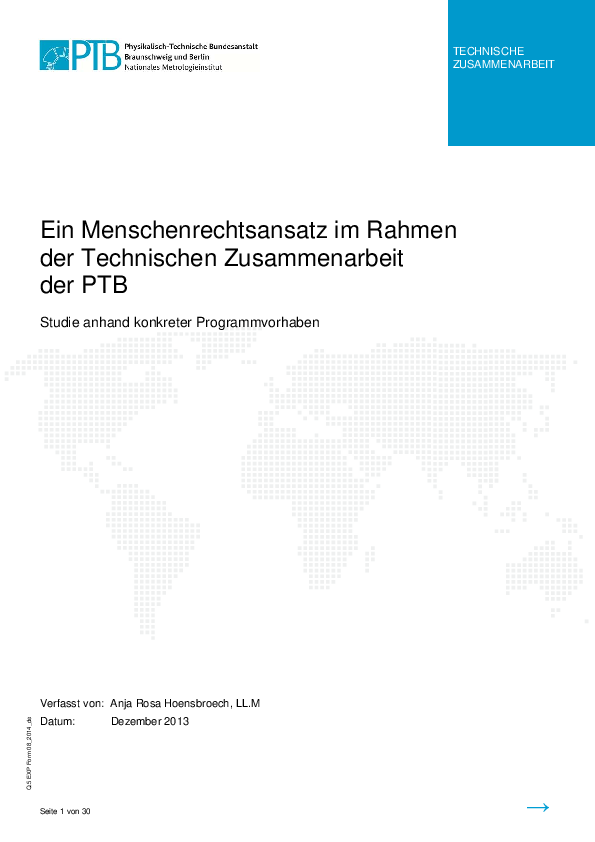 The study examines PTB's Technical Cooperation from a human rights approach. The document describes both positive and potential negative effects of PTB's work in this area and makes recommendations as to how the positive effects on human rights could be further strengthened.