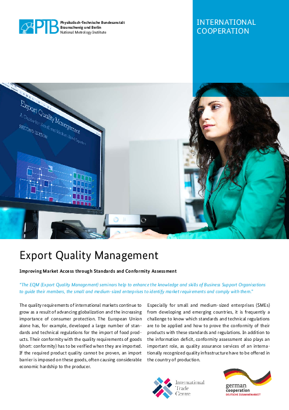 The website presents publications related to the regarding the concept of “Export Quality Management”, created by the International Trade Centre (ITC) and PTB.