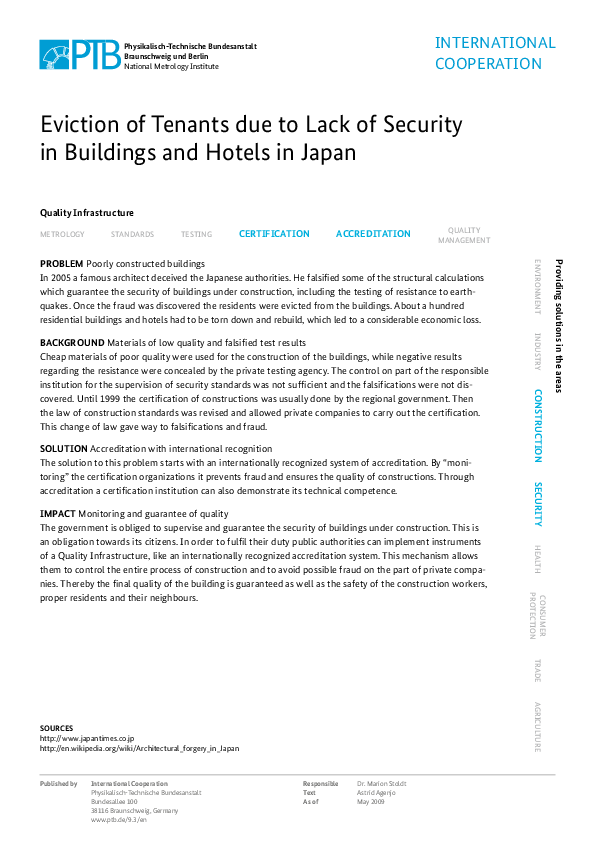 The publication describes problems in the construction and security of buildings caused by low quality materials and falsified test results in Japan. Solutions in the areas of certification and accreditation are highlighted. Having an internationally recognized system of accreditation and accredited certification bodies minimizes the possibility of fraud and assures quality.