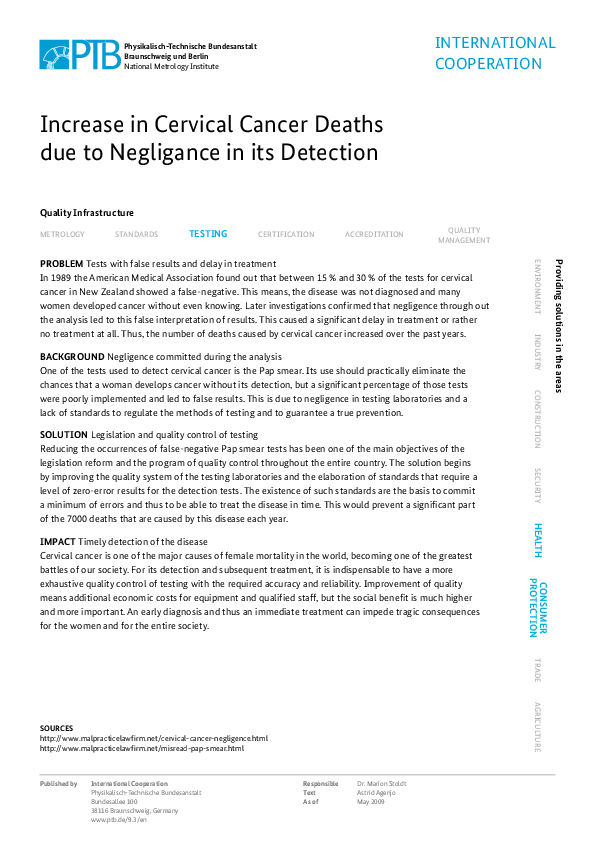 The publication deals with the consequences of inaccurate tests used to detect cervical cancer. The false-negative tests were caused by ineffective testing laboratories and a lack of standards to regulate the methods of testing and ensure prevention.
