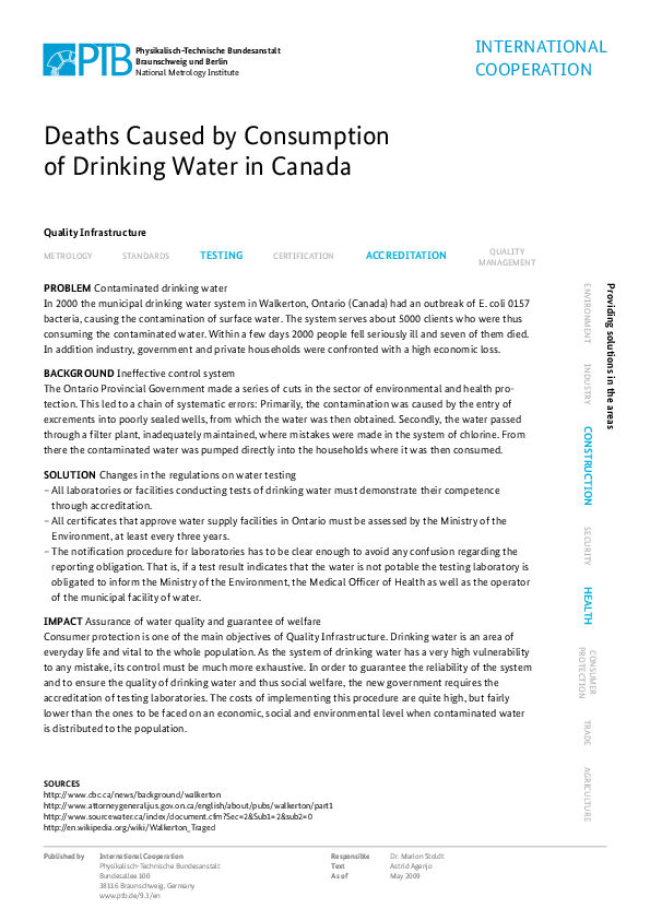 The document describes how an ineffective control system led to deaths of consumers caused by the contamination of surface water. By changing the regulations on water testing, requiring the accreditation of testing laboratories, the control of the drinking water quality could be improved.